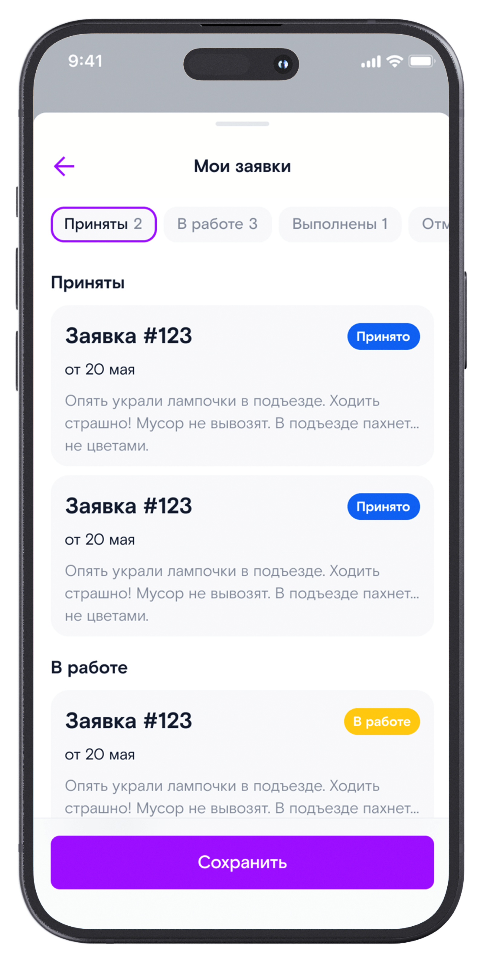 Опишите проблему, приложите фото или видео и отправьте заявку в УК. Следите за ходом ее выполнения, общайтесь с УК в чате и оценивайте закрытые обращения.